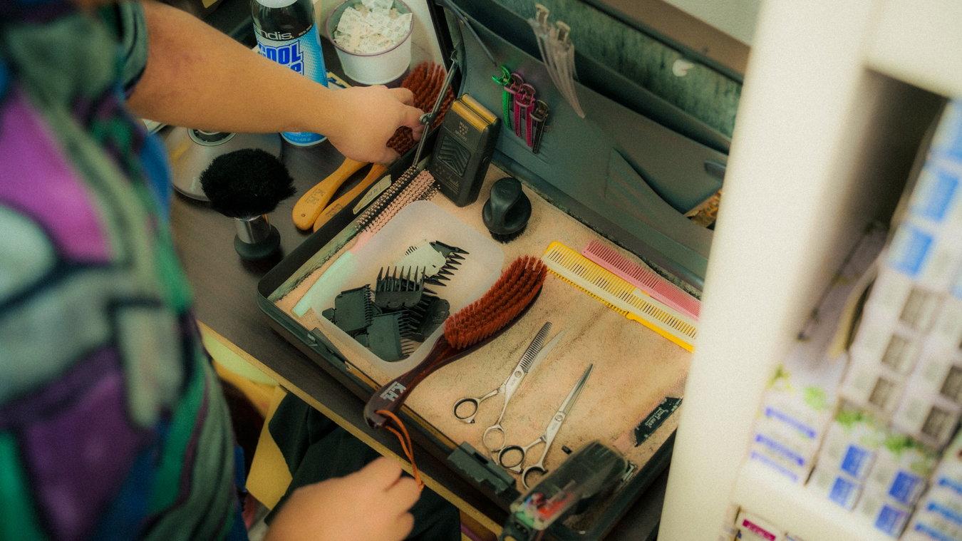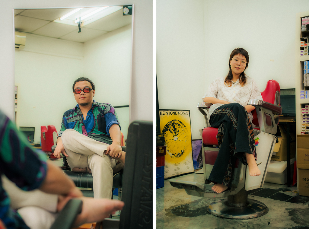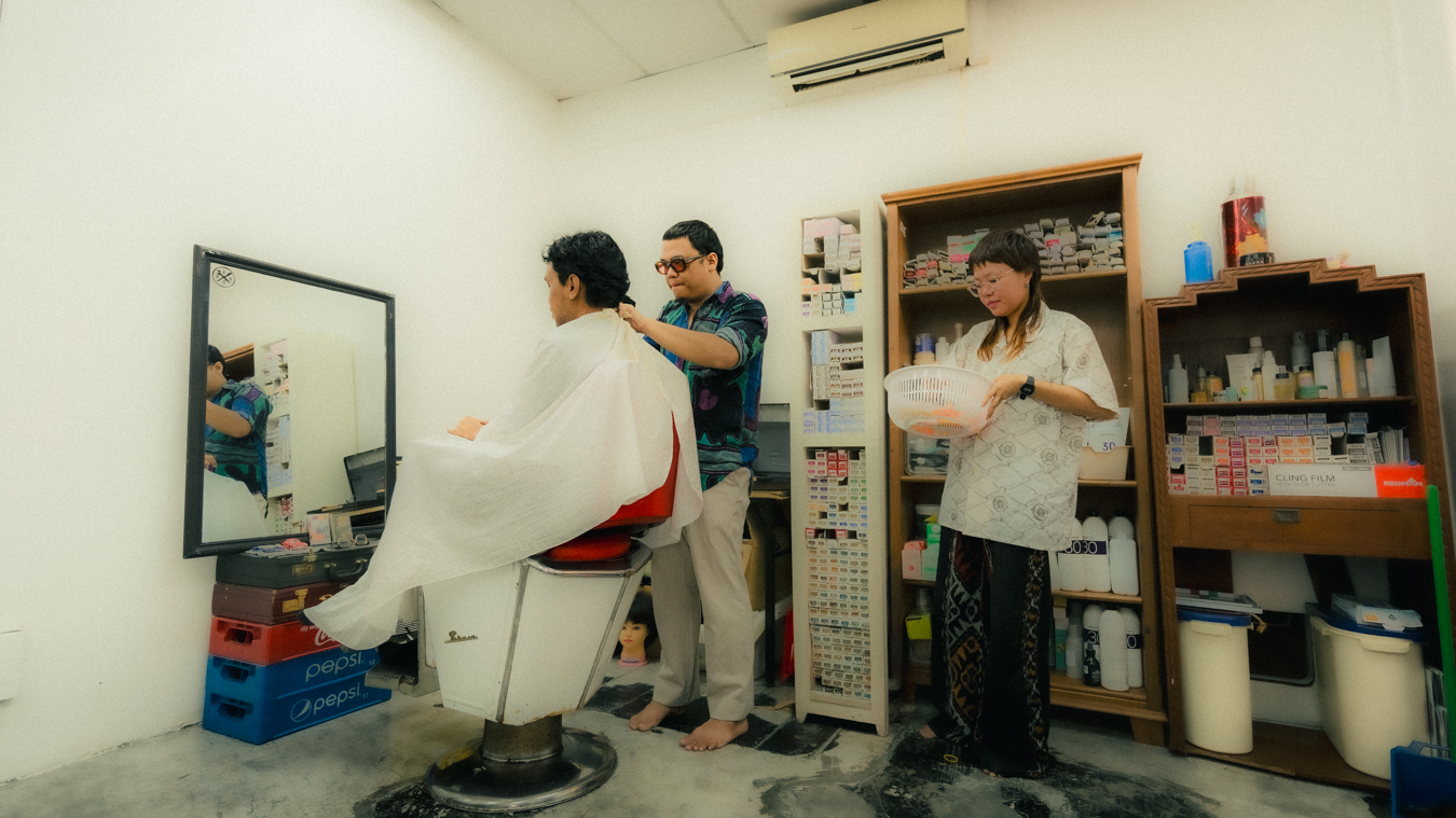 While they run the business as a unit, Akid and Tingwei usually operate in their own zones. Each has a station at opposite ends of the studio, with their respective tools splayed out and ready for work. However, this distance disappears when a specific detail requires a second pair of hands. For instance, when Tingwei needs to use a razor on clients, she often beckons Akid over; his years in the barbershop have made him a master of the tool, and under his guidance, she has steadily built the confidence to make it a part of her own kit.