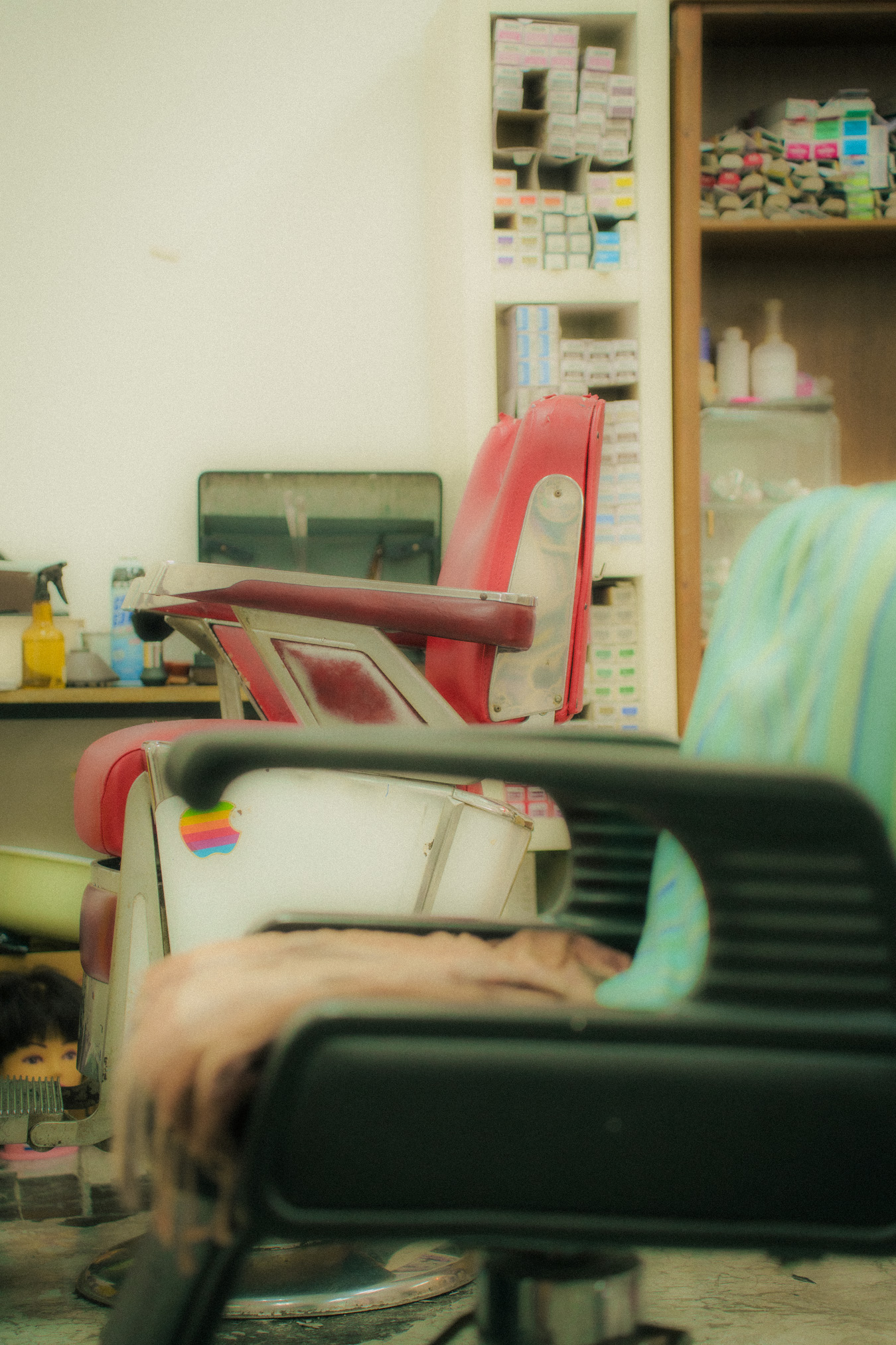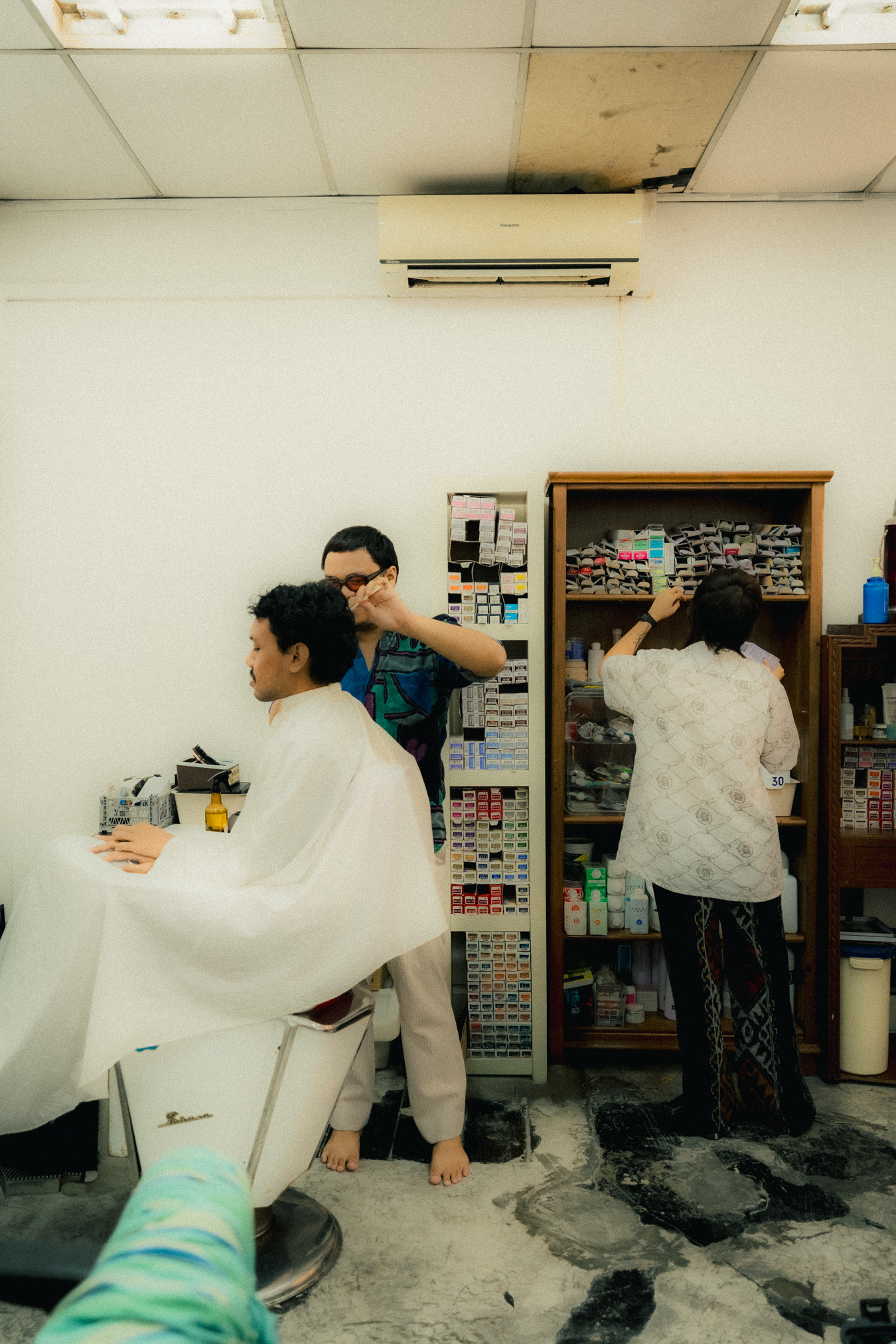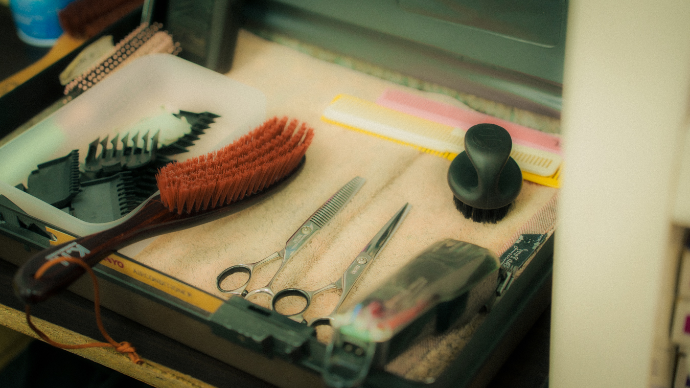 While they run the business as a unit, Akid and Tingwei usually operate in their own zones. Each has a station at opposite ends of the studio, with their respective tools splayed out and ready for work. However, this distance disappears when a specific detail requires a second pair of hands. For instance, when Tingwei needs to use a razor on clients, she often beckons Akid over; his years in the barbershop have made him a master of the tool, and under his guidance, she has steadily built the confidence to make it a part of her own kit.